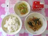今日の献立は、麦ごはん、ビビンバ(具)肉と卵、ビビンバ(具)ナムル、わかめスープ...