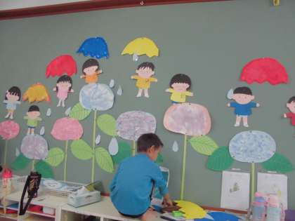 6月になり教室掲示を変えました。今回はみんなで和紙を染めてアジサイを作り,傘も自分たちでローラを使って塗りました。そして今回は掲示のレイアウトもしてもらい,とてもすてきな教室になりました。毎日にぎやかな5組のみんなを後ろから優しく見守ってくれています。すてきですね☆