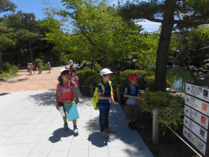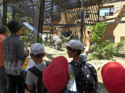 動物園では,クイズラリーをしました。クイズになっている動物(レッサーパンダ・ライオン・ワオキツネザル・シロテテナガザル・キリン)のところは,全グループがいきます。それ以外には,ゴリラ,オオサンショウウオなどが人気がありました。
