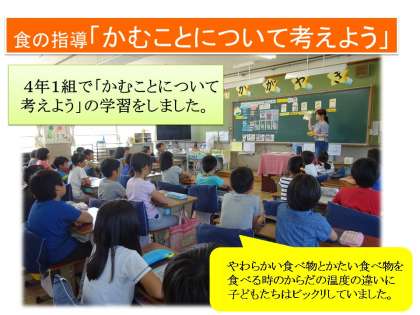 6月15日の3限目に4年1組で「かむことについて考えよう」というテーマで学習しました。かむとよいことがたくさんあることや,実際に5回かんで食べた状態と30回かんで食べた状態を比べて,唾液の出方やあごの動き,味の変化などの違いに気づくことができました。子どもたちは,「今まであまりかんで食べていなかったけれど,よくかんで食べようと思った」「かむことがこんなによいことがあるとは知らなかった」などの感想を書いていました。ご家庭でも,かみごたえのある食べ物を食卓に出していただき,よくかんで食べるように声をかけていただければと思います。