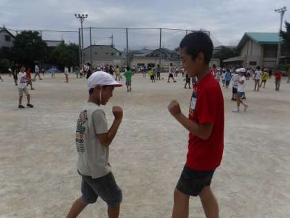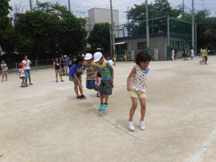 それぞれのグループで,おにごっこをしたり,どんジャンケンをしたり,大なわをしたりなどして遊びました。暑い中でしたが,よく走り回っている子が多かったです。