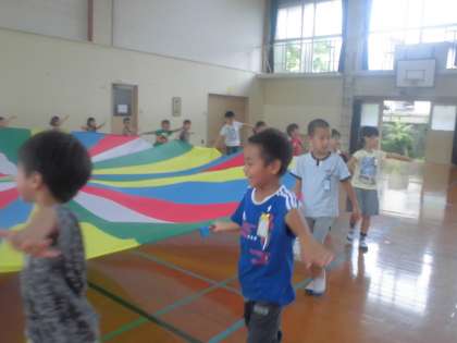 1年生と2年生は、それぞれ体育館でパラバルーンや魔女のタンゴを踊ったり、5組の紹介プレゼンテーションを見たりしました。