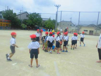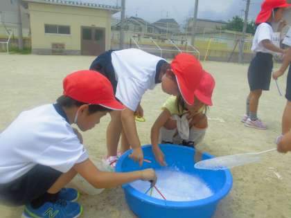 生活科の学習で、1年生みんなでシャボン玉で遊びました。持ってきたグッズやストローでは、うまくできなかった5組の子たちに、友だちがうちわを貸してくれました。