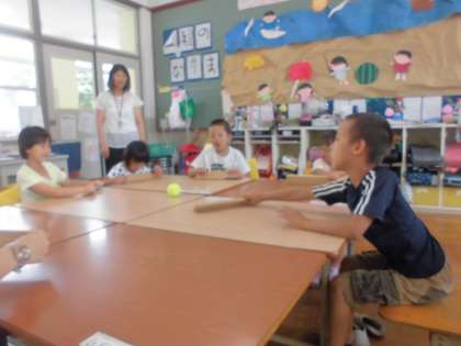 いよいよ明日から夏休み!ということで今日は5組で卓球バレーをしました。机を並べて座りながらできるスポーツで,1年生は初めてでしたがとても楽しんでやってくれました。ころがってきたボールを相手に返すため,相手意識や力加減が大切になってきます。何度もボールが落ちることもありましたが,それがまた楽しいようでみんなニコニコの時間となりました。また夏休み明けにもみんなでやりたいねと話していました。
