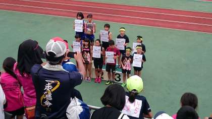 京都府下のチームが集まり,夏休み最初の大会で日頃の練習の成果を競い合いました。桂東ランナーズも4〜6年生の大勢の子どもたちがエントリーし,走・跳・投のそれぞれの種目に挑戦しました。