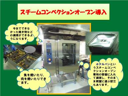 桂東小学校の給食室に「スチームコンベクションオーブン」が設置されました。京都市では,今年度より5年計画で新たな調理器具である「スチームコンベクションオーブン」を全校導入することが決まっており,これまでの調理器具ではできなかった焼き物をはじめ,学校給食における和食献立の充実と献立の多様化をすすめていきます。これからも,子どもたちにおいしい給食の提供と和食の継承をしていきたいと考えています。