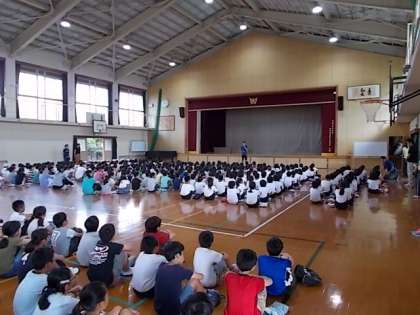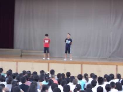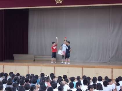 今日の児童朝会では,運動会の応援団長を務める児童の自己紹介と赤組・白組を決める紅白決めがありました。