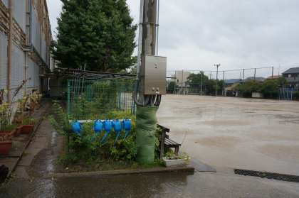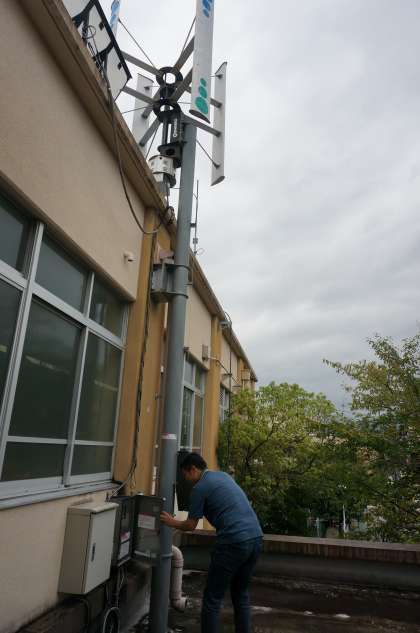 桂東小学校も小窓を閉めたり,風で飛びそうな物を校舎内に入れたりして対策をしています。本館屋上の風力発電の機械もロックをかけました。