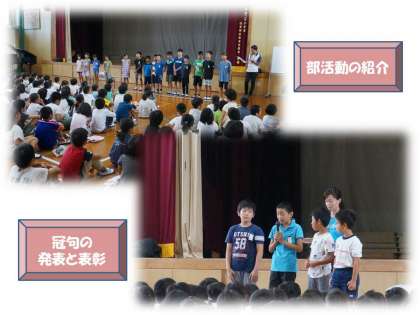児童会本部役員や栽培委員会からのお知らせやクイズの後,冠句の特選の発表&表彰と夏休み中の部活動の活動紹介がありました。