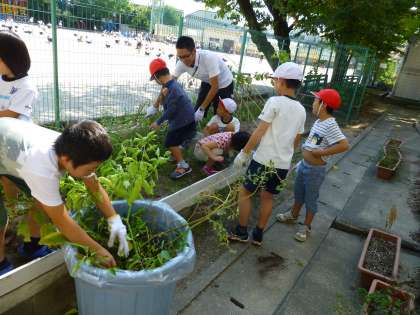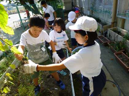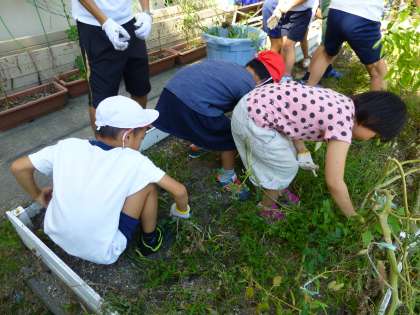 5組は、学級園の草ぬきにみんなで取り組みました。