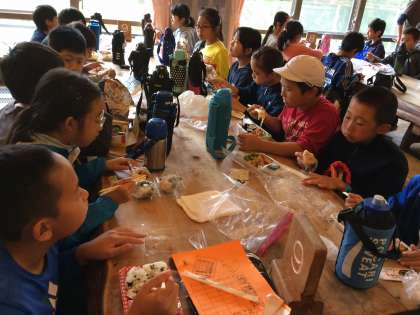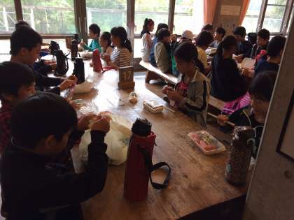雨が降りはじめたので、食堂で食べました。美味しいお弁当で午後の活動に備えます。