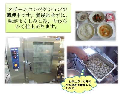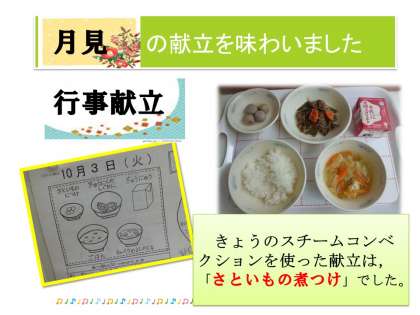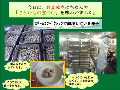 今日の献立は「月見献立」のごはん・牛乳・牛肉のしぐれ煮・さといもの煮つけ・キャベツの吉野汁でした。その中の「さといもの煮つけ」をスチームコンベクションで調理しました。スチームコンベクションは,鶏肉の焼きものに始まり,焼き魚,枝豆の蒸し料理と続き,煮物は初挑戦です。今日の子どもたちの最初の驚きは,ハンドル付きホテルパンでした。副食棚をあけて,ピッカピカに輝いたホテルパンを初めて見た子どもたちは,「すごい!」「何が入っているの?」「持ちたい。持ちたい。」ととても興奮していました。さといもの煮つけを食べた子どもの感想の中には,「中までトロトロで口の中でとろけるようだった」「さといもの旨みがあっておいしい」とおかわりしている児童もいました。