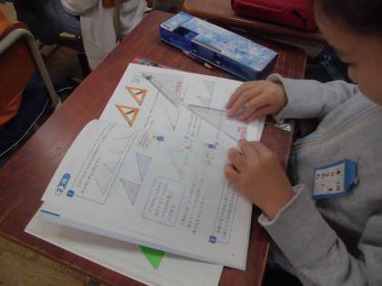 教育実習生に算数を教えてもらいました。三角定規の角について,大きさの比べっこをしました。大きい順に並べることができました。