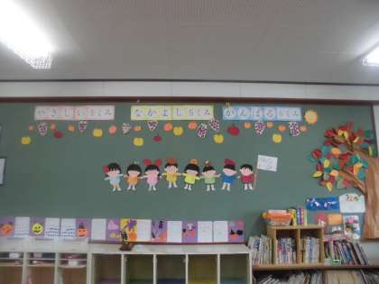 5組の教室掲示を秋バージョンにしました。子どもたちが運動会の練習の合間をぬって葉っぱや果物をたくさん切ったり貼ったりしてくれて,とてもにぎやかな壁画になりました。みんなくっついて「どの果物がいい?」と話し合っているようですね。カレンダーはハロウィンのかぼちゃやおばけなど,思い思いのものを折り紙で作っていました。