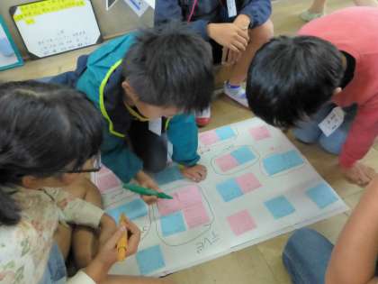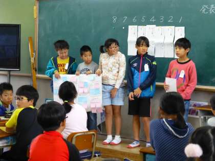 5組の児童も、エコバッグを使ったことや、こまめに電気を消したこと等、自分の取り組みを発表してくれました。班で出た意見を分類し、新たなチャレンジも作りました。