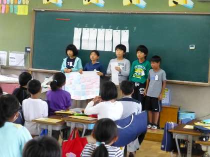 夏休み前に、どんなエコライフの取り組みができるのかを考え、それぞれの家で実践をし、それをみんなで報告し合いました。