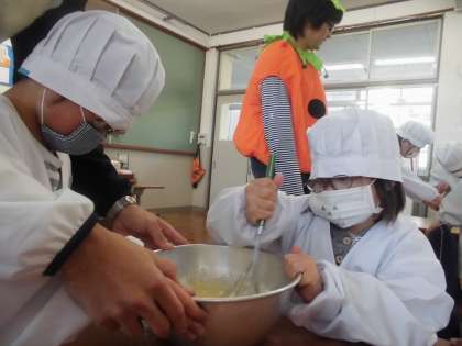 昨日10月31日,5組の教室でハロウィンパーティをしました。事前にALTのアレックス先生に「四角や丸を英語でどう言うのかを教えてもらい,もらった形をぺたぺた貼ってコスチュームを作りました。そのコスチュームからテーマを決めて「魔女」「ドラキュラ」「うさぎ」などに変装してファッションショーを行いました。ホットケーキも作り,いざ食べようとすると…なんとこわ〜いおばけがやってきてホットケーキを取ってしまいました。みんな必死に「トリックオアトリート!」と言ってホットケーキは無事取り返せました。とても楽しい時間になりました。