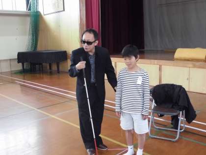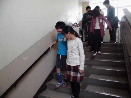 視覚障害者の方はどんな時に困るのか,どんなお手伝いをすれば助かるのかを考え学習しました。手引きの仕方を松永さんに教えていただき,実際にアイマスクをし,友達に手引きで学校を歩きました。実際に体験することで子どもたちからもたくさんの感想を聞くことができました。