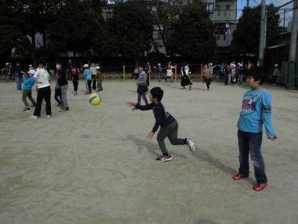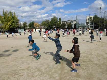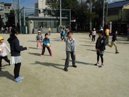 1年生から6年生までが小グループになり遊ぶたてわり遊び。4年生は低学年の子には優しく,高学年には全力でボールを投げたり追いかけたりする姿が印象的でした。