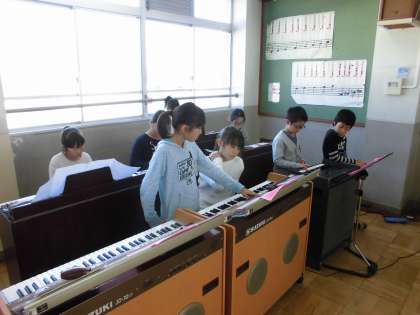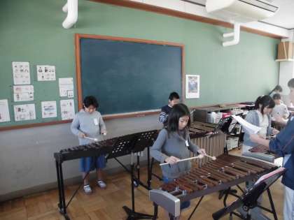 学習発表会に向けて4年生では,毎日合奏の練習をしています。授業中だけでなく,休み時間に音楽室に行き,各楽器を練習しています。