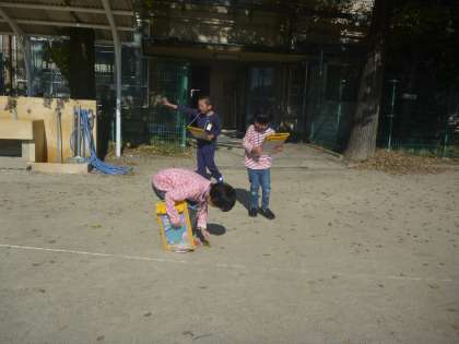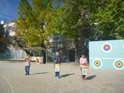 1年生は、秋を見つけに、たんけんバッグを持って校庭へ出ました。