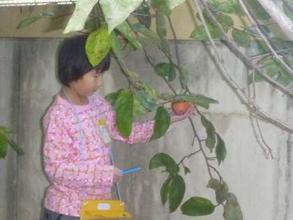 いちょうの葉やさくらの葉、どんぐり、それから柿を見つけていました。落ちている葉や実を拾って、大事そうにたんけんバッグのポケットにしまっていました。