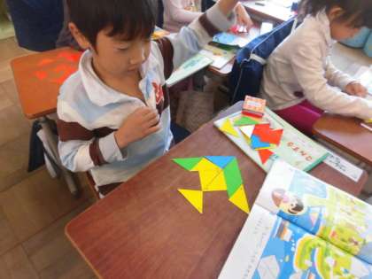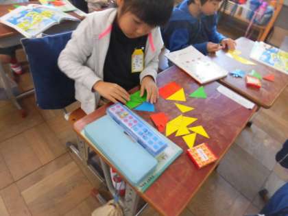 算数「かたちづくり」の学習で,三角形の色板を使っていろいろなものを作りました。ヨット,家,魚など難しいものもあり,「何枚つかっているのかな。」「こう向きかな。」と考えながら楽しんで作っていました。
