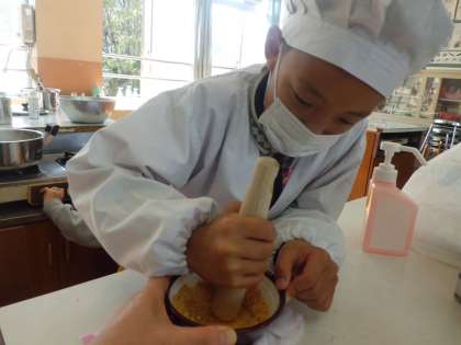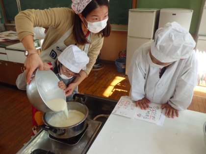 国語科の学習ですがたをかえる大豆を学習し,今日は5組の3年生と大豆からお豆腐を作ってみました。いくつもある工程を一つひとつ丁寧に行い,豆のいい香りが広がりました。おからを取り除いたあと,「豆乳を鍋に投入!」と笑いもありながらも真剣な表情の3年生。途中,少し待つ時間があったので,栄養教諭の増田先生と大豆から『きなこ』を作りました。すり鉢でゴリゴリするのは大変でしたが,「昔の人は時間をかけて食べる工夫をしてきたんだね。」と,学習したことを振り返りながら作りました。できあがたった豆腐は5組のみんなに振る舞い,「おいしい!」と嬉しい言葉をもらいました。