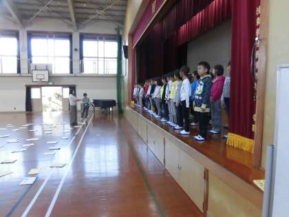 今日は,体育館の舞台で学習発表会に向けて練習しました。これまでの練習とは一味違った緊張感をもって取り組むことができました。日々の練習の中で,少しずつ上達していってほしいと思います。