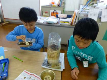 先日、4年生の児童がなめこ栽培キットを5組に持ってきてくれました。