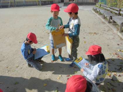 きれいな色の葉っぱや大きな葉っぱ、木の実など秋のすてきをたくさん発見しました。葉っぱやどんぐりをつかって自分だけのたからものをつくっていきたいね。