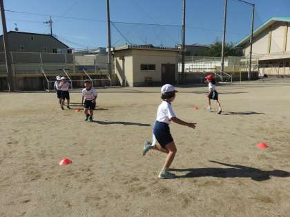安全に楽しく遊ぶための最低限のルールを確認した後は,ルールは子どもたち同士で決めます。コーンの置き方や走り方は自由です。誰かがしっぽを取られてしまうまで,いつまでもリレーは続きます。