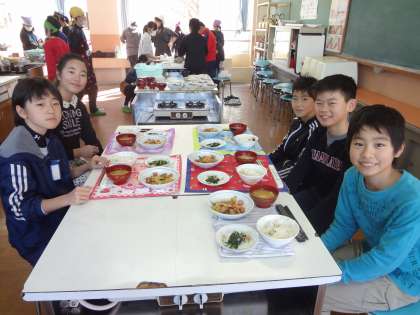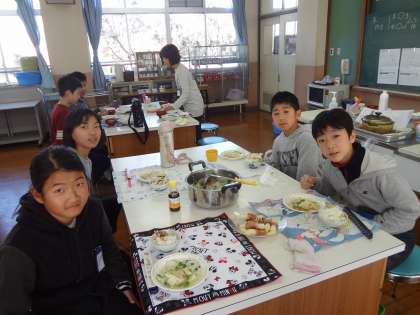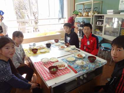 今日は調理実習でした。これまでの家庭科の学習で,献立から栄養まで色々と考え,準備をしてきました。今日は,どの班もとても段取りよく調理し,協力して一食分作ることができました。集中して調理をしたので,みんな一安心で「いただきます」をしました。