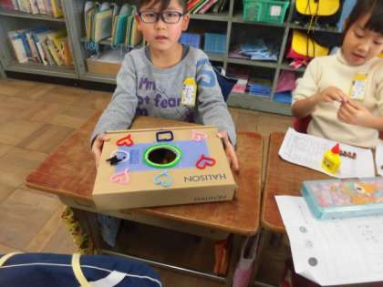 拾ってきたどんぐりやまつぼっくりを使っておもちゃ作りを始めました。前に書いた設計図をもとにどんどん作っていきます。くじびきやどんぐりのぼうしを並べた家など,アイデア満載です。