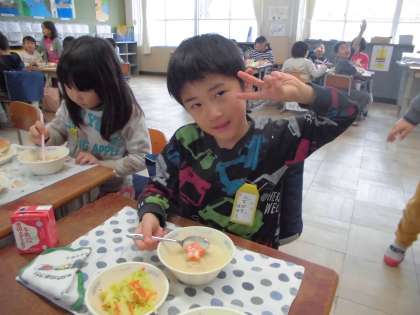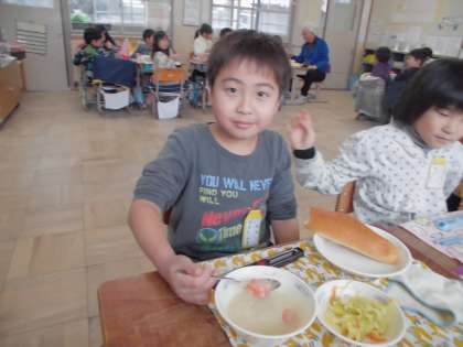 本日の給食「豆乳のクリームシチュー」には調理員さんが手間をかけてくり抜いてくださった星形のキャロットがクラスに2つ入っていました。