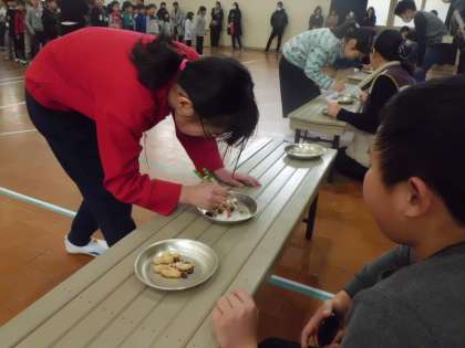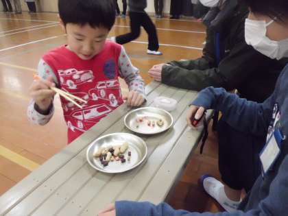 給食週間の取り組みで「豆つまみ大会」がありました。クラス対抗で落花生・金時豆・大豆のいろいろな豆をお箸でつまんで,クラス対抗で行いました。自由産観されている保護者の方の応援もあり,どのクラスもクラス一丸となって,とても頑張っていました。おはしを正しくもつことは,指の力が弱かったり,正しいイメージができない子どもたちにとっては,簡単にできることではありません。毎日これからも練習して持てるようになってほしいと思います。ご家庭でも是非見ていただければと思います。