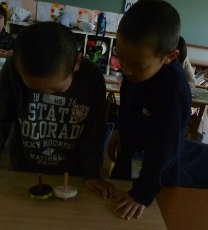 それを見ていた3年生の児童が、すぐ横にこまをうまく回しました。