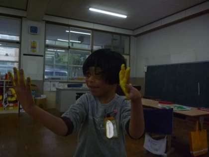 1年生の3人は、両手に黄色い絵の具をつけ、花びらをつける部分に手形を
