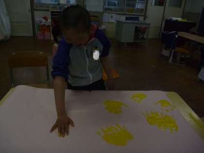絵の具の感触にドキドキしながら…それでもしっかりと手形を押し付けました。