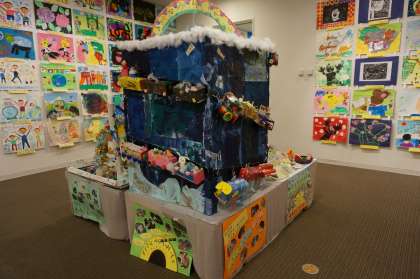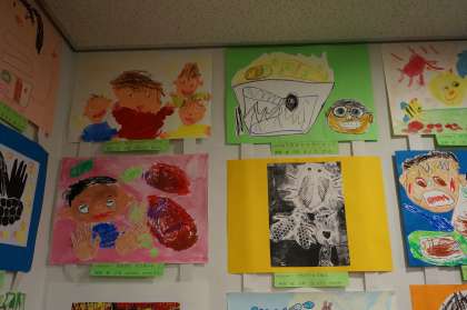 桂東の育成学級は後期に出品しました。平面作品と桂川中学区の3小学校の合同立体作品が展示されていました。どの作品も子ども達が,生活や学習の中で興味を持ったものや関心のあるものについて,思いが伝わる表現をしていました。子ども達の素直な表現と指導した先生方の工夫が伝わる作品展でした。