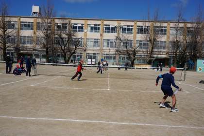 参加者全員がペアを組み,予選リーグを戦いました。担当の先生も参加して卒業していく6年生との最後の校内試合を楽しみました。