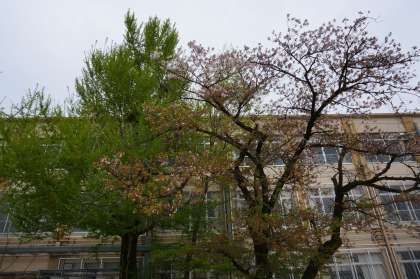 桂東小学校の桜の木はすっかり葉桜になりました。また運動場の銀杏の木の葉が黄緑色に色づいてきました。