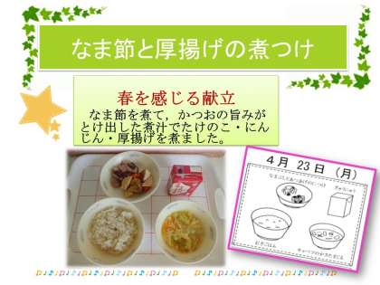 今日のこんだては,毎年4月に登場する「なま節と厚揚げの煮つけ」でした。