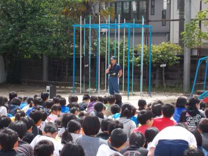 今日は,午前中に避難訓練がありました。桂出張所の消防隊の方々にも来ていただき,避難訓練を見ていただいて,お話をしていただきました。