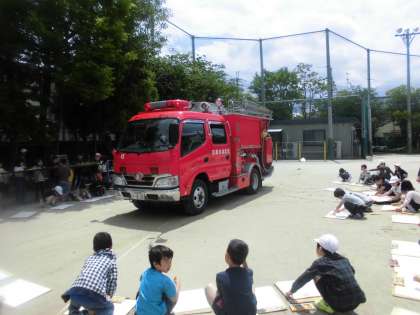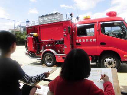 桂消防出張所の職員の皆様にお世話になって,消防車の絵を描きました。