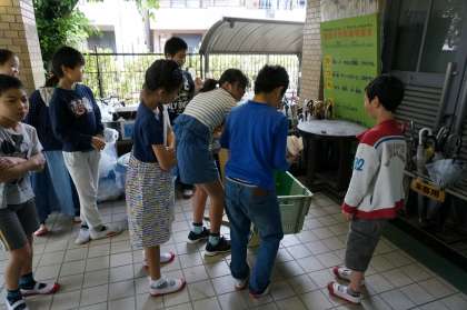 木曜日の朝は,環境委員会の子ども達が各クラスで集めている牛乳パックを計量したり,アルミ缶を集めたりしています。