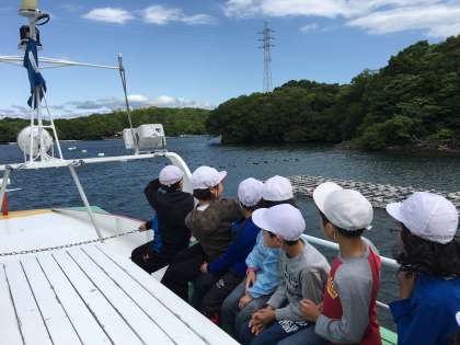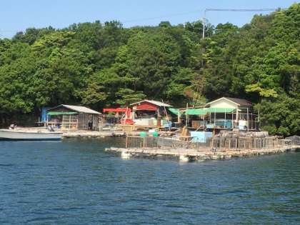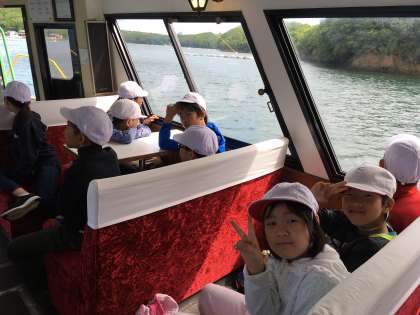 仲よし港を出発して、船に乗っています。真珠の養殖作業をされている方も、こちらに手を振ってくれました。
