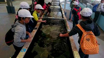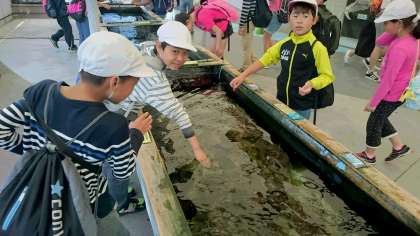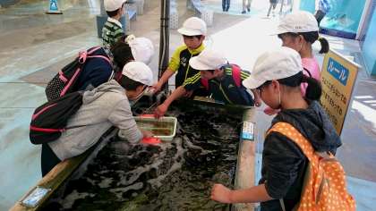 昨日の磯観察で慣れたのか、生き物に触れるコーナーでは、躊躇なく水に手を入れる子が多いです。