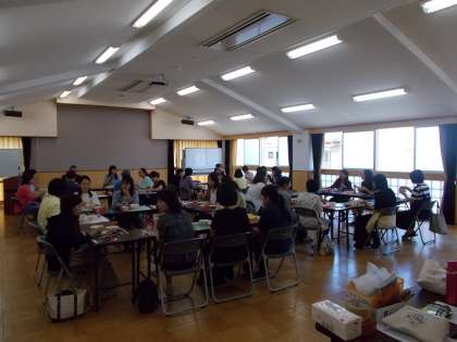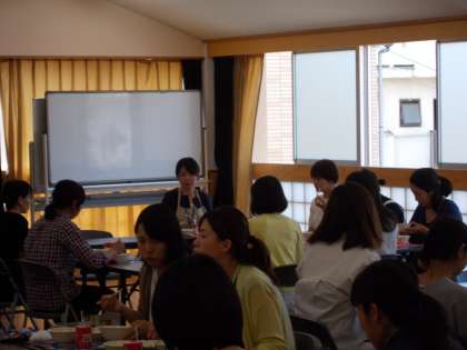あいルームで給食試食会が行われました。1年生の保護者の方々は,栄養教諭の増田先生のお話のあと,1年生の給食の様子を見たり,実際に給食を食べたりしました。