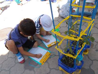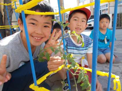 トマトの観察をしてみると,小さなトマトがたくさん実っていました。そのトマトの実はまだまだ小さく,とってもかわいい赤ちゃんトマトもありました。トマトを発見するたびに嬉しそうに「トマトができてる!!」「先生,こんなに小さいトマトもあるよ。」と報告してくれました。これからもっと大きくなって,赤くなることを心待ちにしている子どもたちです。
